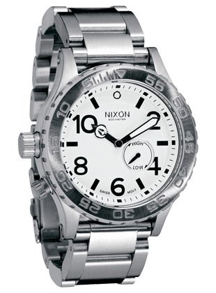 Nixon 42-20 Watch - Men's White, One Size - The clock Nixon 42-20 Tide is the version is slightly smaller than the mass (and announced massive) 51-30 model. Same solid stainless steel case with screw-in crown, same Swiss movement, same heavy, all-business look. Same burly 200-meter water resistance too, plus a 24-hour analog dial flood. So it is not as likely to tear your shoulder from the socket when you reach paddle in the lineup or a beer