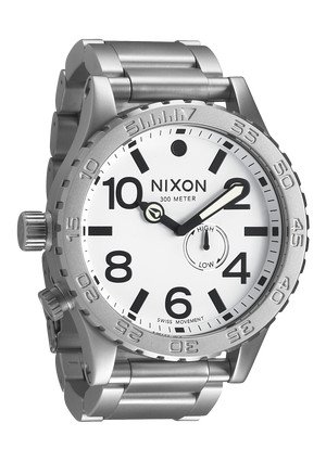 Nixon 51-30 The Tide Stainless Steel Mens Watch A0571166 - Stainless steel case with a stainless steel bracelet. Uni-directional rotating bezel in stainless steel. White dial with luminous hands and alternating Arabic numerals and stick. Minutes marker around the outer edge. Select Type: Analog. Quartz movement. Scratch resistant sapphire crystal. Screw-down crown. Solid case back. Case diameter: 51 mm. Round shape case. Bandwidth: 25 mm. Distribution double locking clasp. Water resistant to 300 meters / 1000 feet. Functions: hours, minutes, flood. Clock casual style. The Nixon 51-30 Tide Stainless Steel Mens Watch A0571166., Nixon 51-30 The Tide Stainless Steel Mens Watch A0571166.