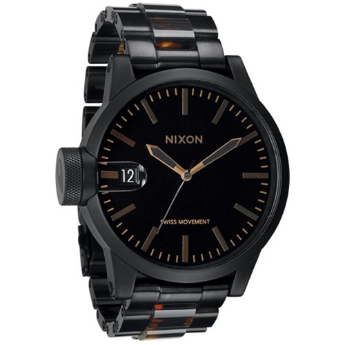 NIXON Men's NXA1981061 Black Ion-Plated Stainless Steel Bracelet with Tortoise Shell Accents Watch - Just like the MenAAAs Nixon Chronicle SS Watch, you donAAAt say much, but when you do, people better watch out. The minimalistic face counters this larger-than-life clock. A huge triple gasket crown accents the dial and you can time move back 5 minutes if you are late, and the date magnifier helps remind you what day it is, even if you are to see your eyes to be bloodshot straight.